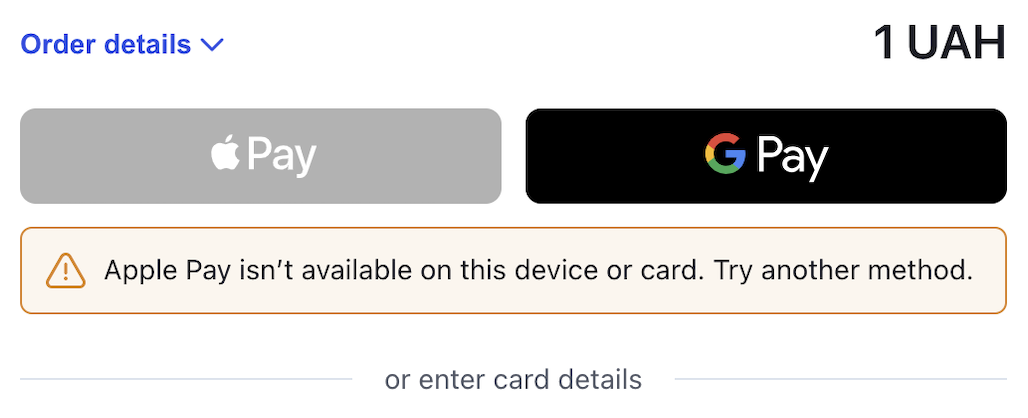 When the hosted checkout is loaded or the payment widget is initialized, the system checks whether Apple Pay is supported on the customer’s device. If the Apple Pay SDK indicates that the method is not supported, the Apple Pay button in the checkout/payment widget will be inactive, and a message will be displayed next to it stating that the method cannot be used on this device.