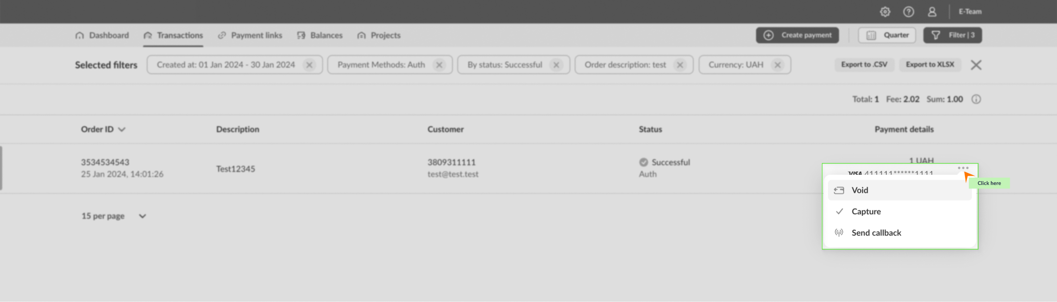 Доступна лише для успішних транзакцій Оплати (Purchase), Виплати (Credit) або Повернення (Refund). Для транзакцій Резервування (Auth) квитанцію можна завантажити, якщо за нею було проведено Зарахування резерву (Capture). - Відправка callback - а щодо платежу на ваш ендпоїнт.