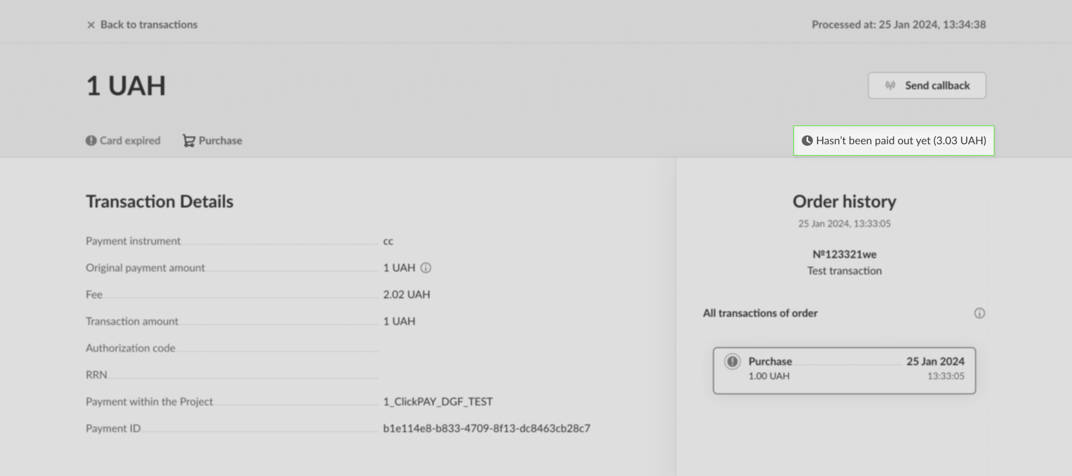 Також, в залежності від бізнес-моделі роботи мерчанта, у деталях платежу може розміщуватися інформація про те, чи було проведено виплату за ним на ваш банківський рахунок.