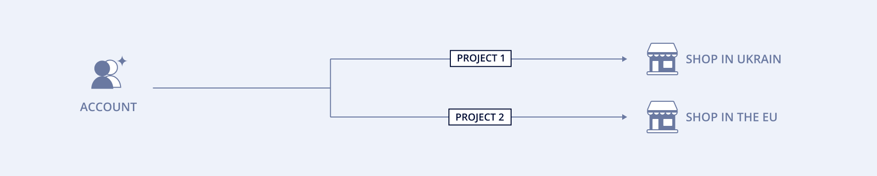 Наприклад, у вас є магазини на території України та ЄС, через які ви здійснюєте продаж товару на відповідних ринках. Ви можете розподілити ваш платіжний трафік за геолокаціями, створивши один проєкт для клієнтів українського ринку, а інший - для ринку ЄС. Завдяки цьому ви можете налаштувати прийом платежів у зручній для локальних клієнтів валюті (гривня і євро), у звичному для відповідного ринку форматі платіжної сторінки (різне оформлення нашої платіжної сторінки) з урахуванням його цільової аудиторії, а також у подальшому переглядати аналітику наскільки успішно функціонує кожен із магазинів. Схематично структура облікового запису буде виглядати так: