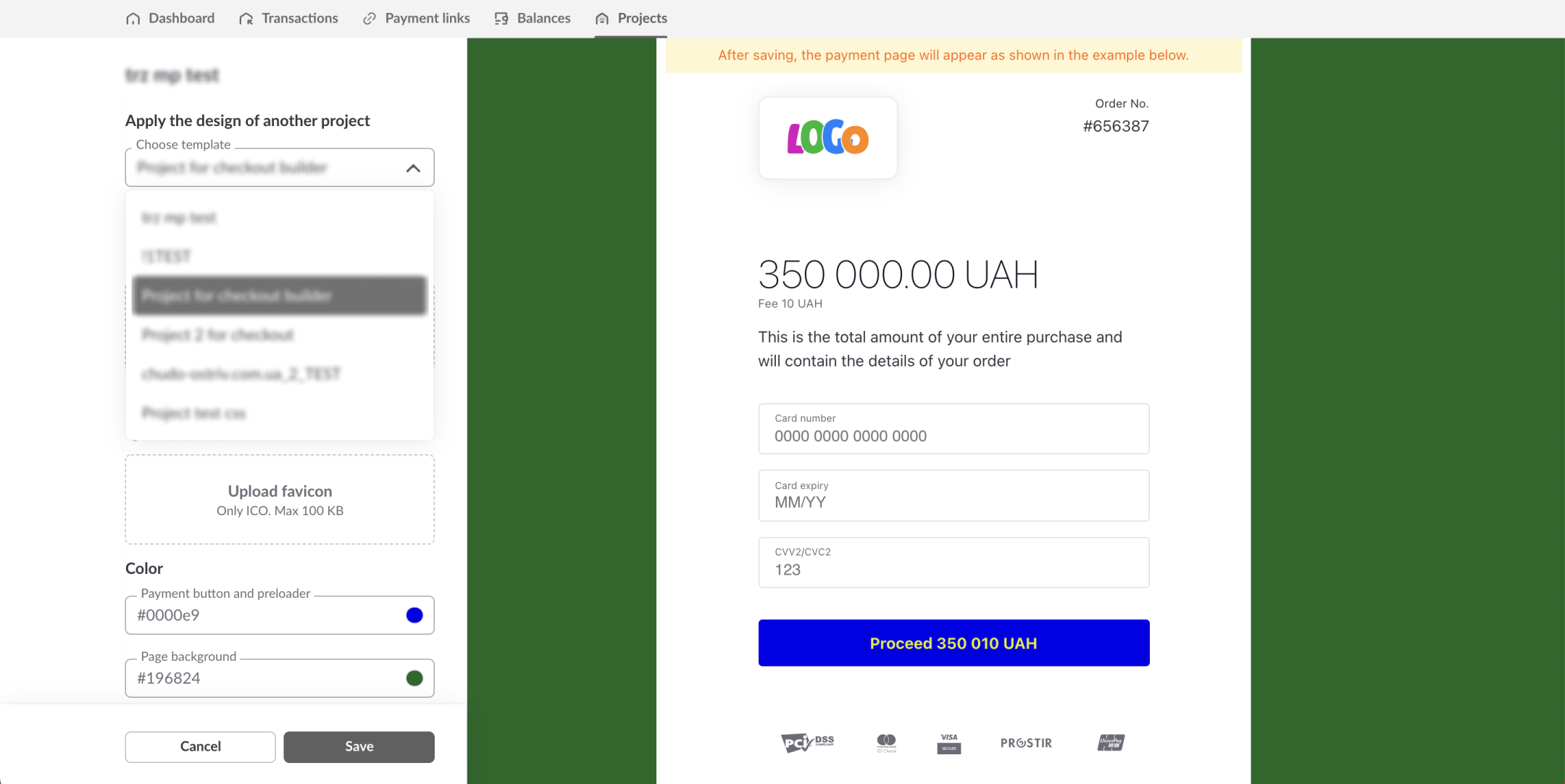 Зверніть увагу, після збереження налаштованого стилю зміни до дизайну платіжної сторінки буде застосовано протягом 30 хвилин.